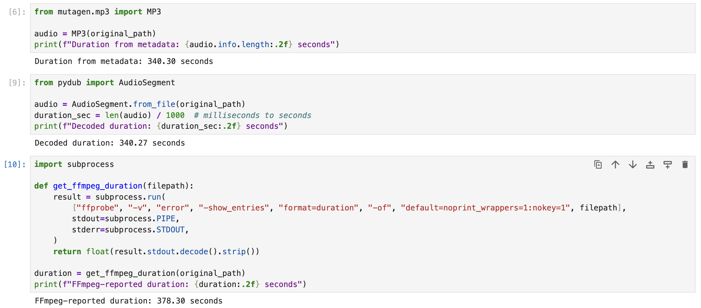 - pydub: 디코딩된 오디오 데이터를 기준으로, 사람이 실제로 재생해 들을 수 있는 오디오 길이를 확인합니다.
